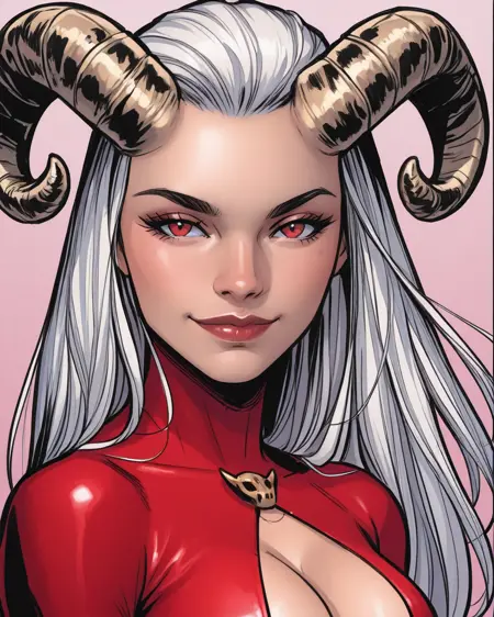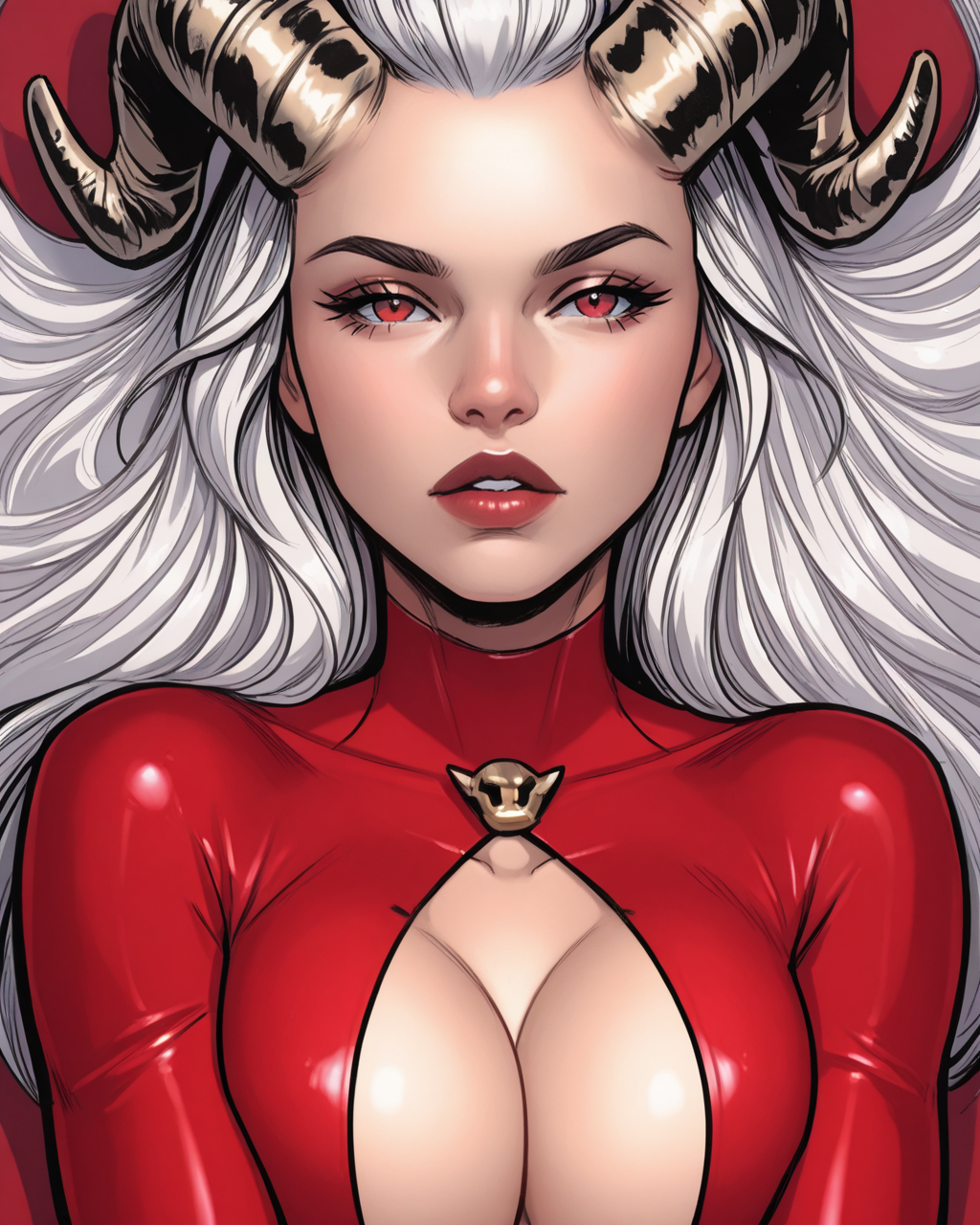 触发词:satana,长发,白发,角,红眼,紧身衣,服装镂空,中心开衩,胸脯