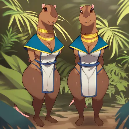 rodent, capybara, brown fur, brown eyes, animal ears, snout, curvy figure, large breasts, cleavage, gold neck ring, gold necklace, blue collar, white loincloth,