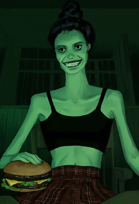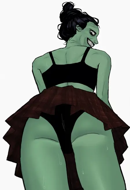 仅触发词及外观:catladyninahchar, 1girl, black hair, black eyes, collarbone, small breasts, colored skin, single hair bun, toned, green skin, horror \(theme\)