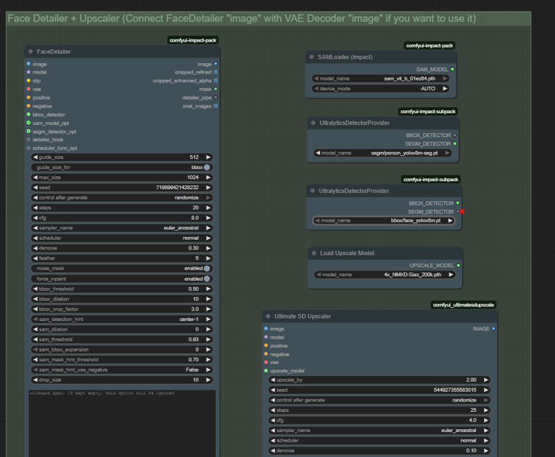 FaceDetailer: Like Civitai Face Fix, this generates a better face for characters specially mouth and eyes, it doesn't always works, specially with faces that are facing to sides or away, you will see a crop of the area regenerated below this node