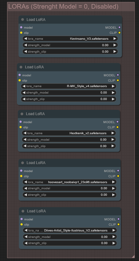 These are the loras, i put five nodes but you can use less (by disabling) or more (just connect them in series)