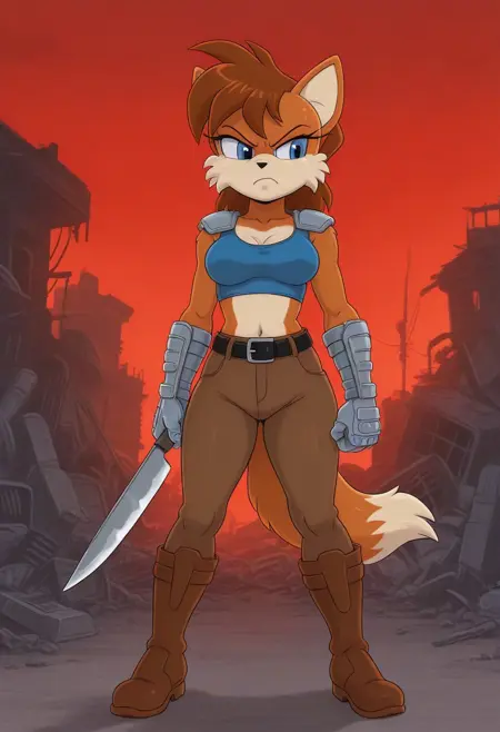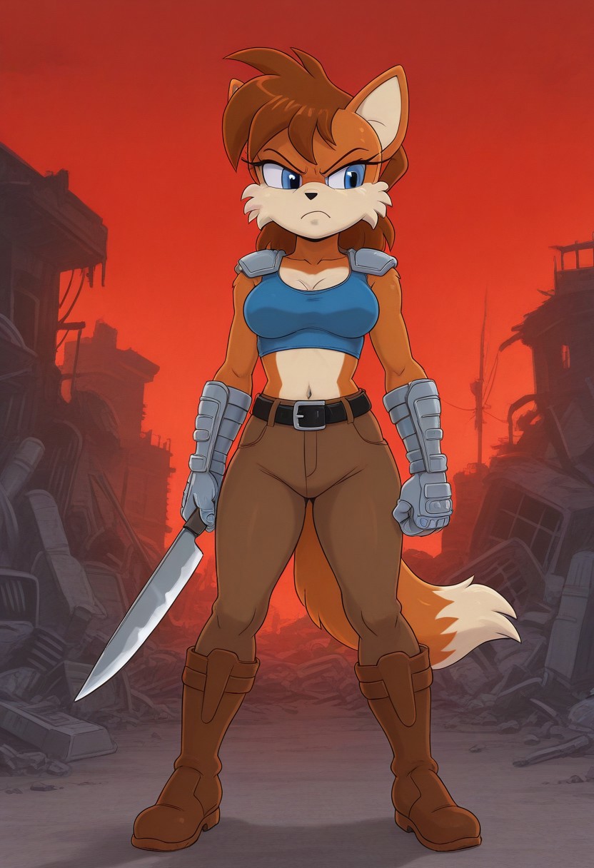 Payback Fox, dark brown fur, brown hair, blue eyes, dark brown tail, blue crop top, metal arms, metal gauntlets, brown trousers, black belt, brown boots