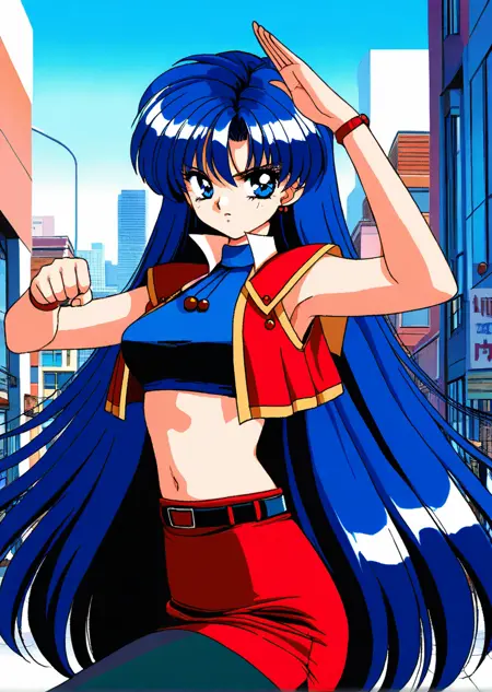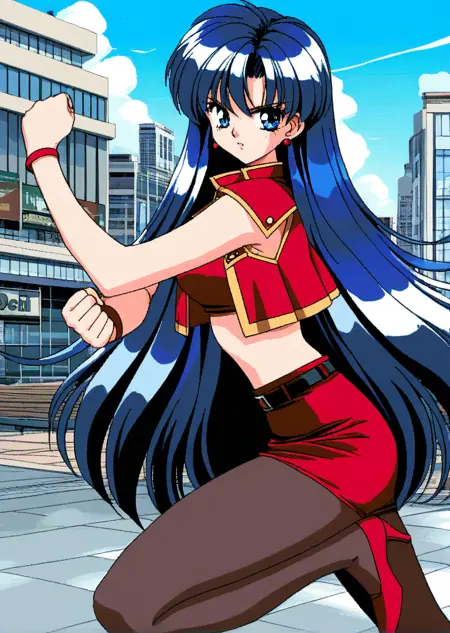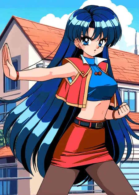 blue crop top, pantyhose, oots, short sleeves, red vest, jewelry,bracelet,red pencil skirt,