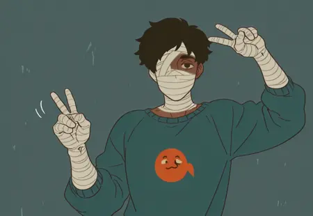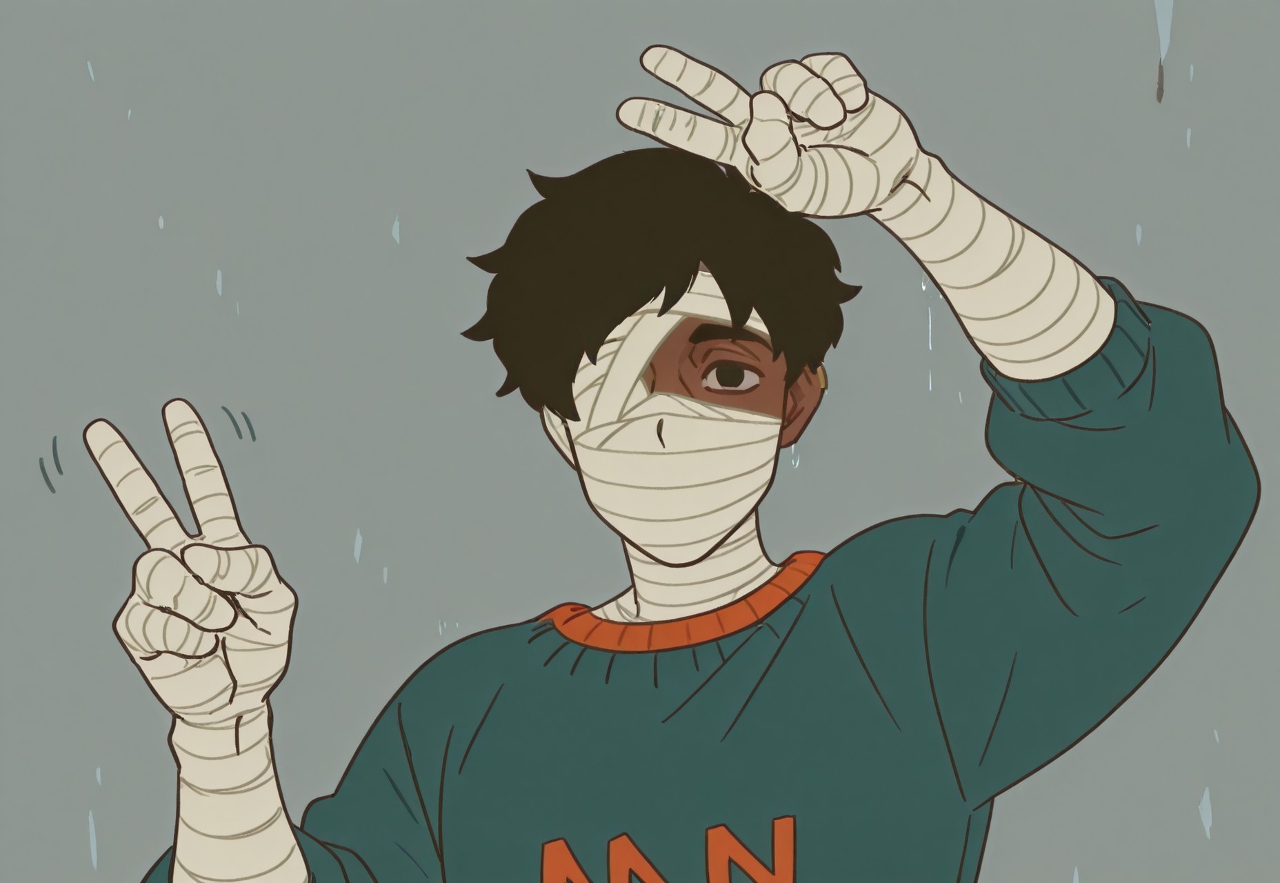 Abu, Mummy, dark skin, covered in bandages, bandages over one eye, black hair
