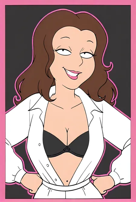 dramandafamilyguy, 1girl, solo, long hair, brown hair, makeup, lips, white shirt, magenta jacket, long sleeves, open jacket, buttons, white collar,