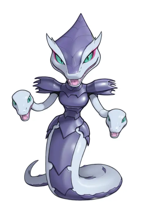 Hamat0M1waS3rp3nt, pokemon (creature), no humans, purple armor, green eyes, teeth, purple crest on head, humanoid serpent, white scales