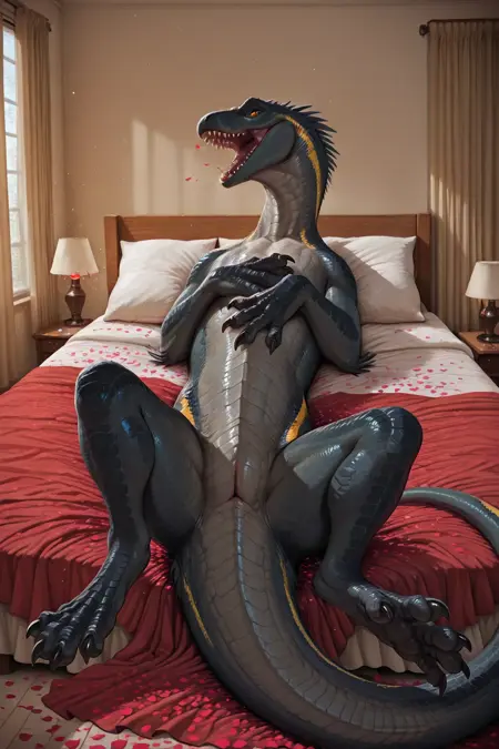 feral raptor, black scales, golden dorsal stripe, claws extended