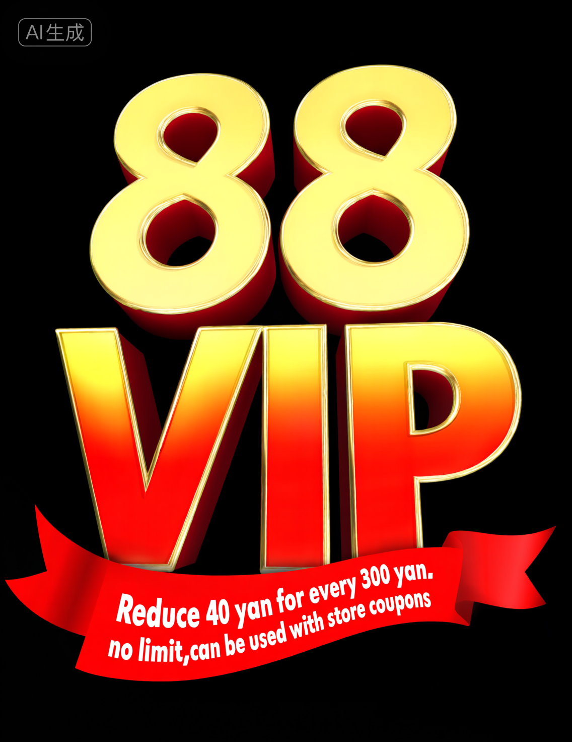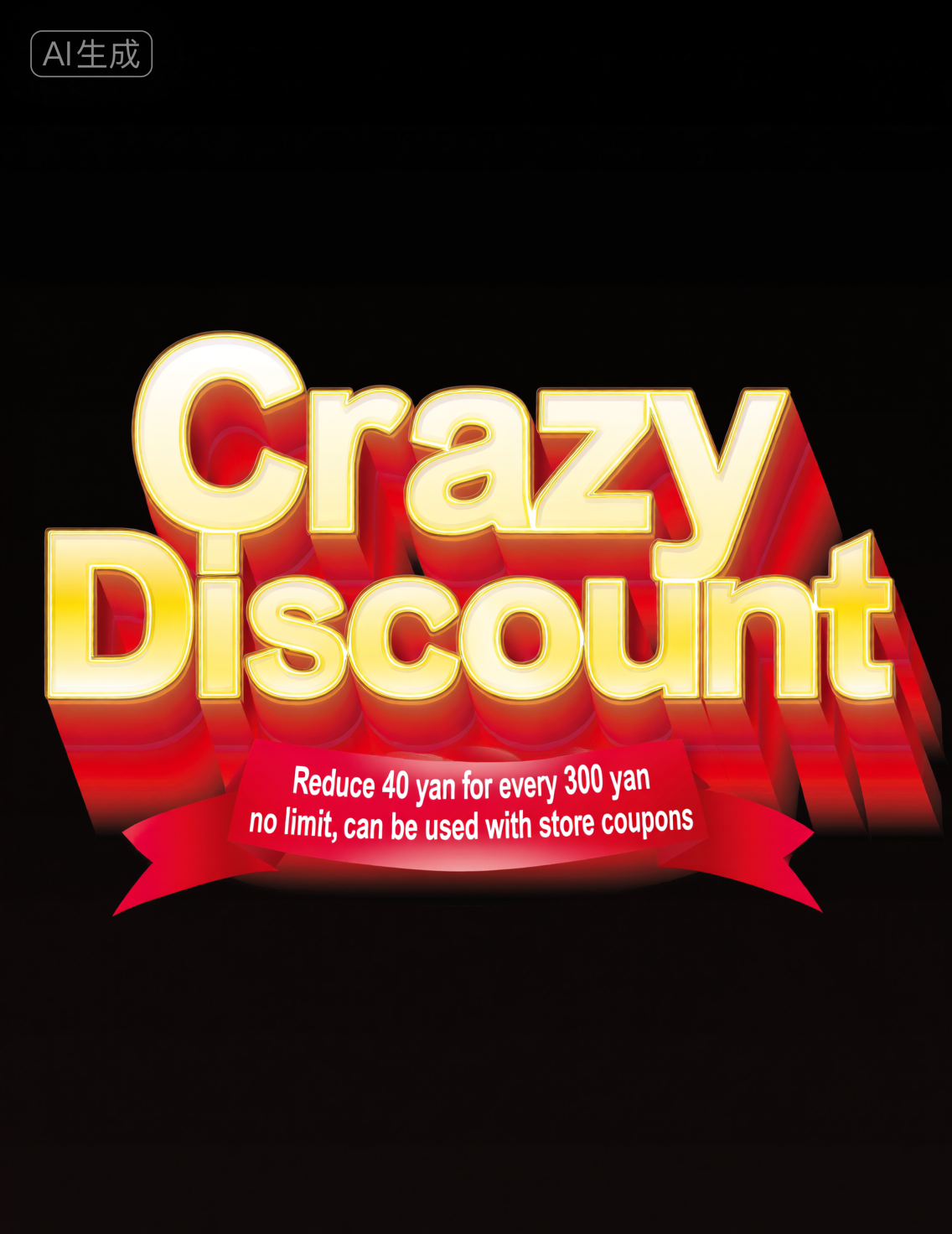 "Crazy Discount" は、ゴールデンレッドのグラデーションで構成された立体的なテキストで、その下には赤いリボンがあり、「300円ごとに40円値引、制限なし、店舗クーポンと併用可」という文言が記されています。黒い背景に対して、ゴールドとレッドの組み合わせは非常に祝祭的で、プロモーションの割引を際立たせています。