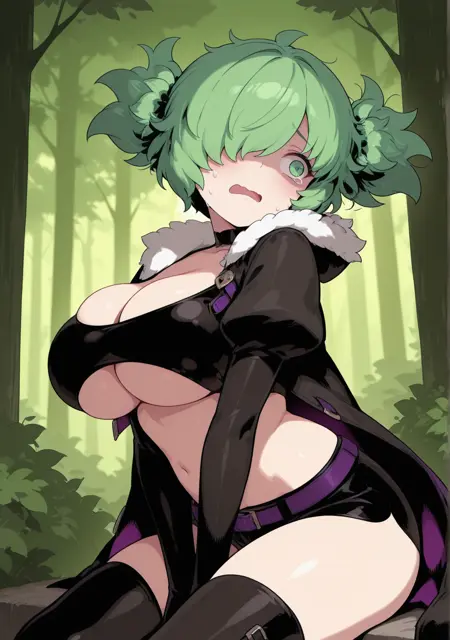 추천: 녹색 머리카락, 녹색 눈, 한쪽 눈을 가리는 머리카락, 어지러운 머리카락, 짧은 트윈테일, 검은 신발, 검은 반바지, 검은 목걸이, 검은 허벅지 양말, 검은 장갑, 팔꿈치 장갑, 검은 재킷, 가슴 노출 디자인, 줄리엣 소매, 털 장식이 있는 재킷, 큰 가슴, 배꼽, 보라색 벨트, 짧은 반바지, 허벅지 부츠, 아랫가슴 노출, 검은 코트, 벌어진 옷
