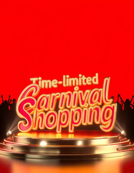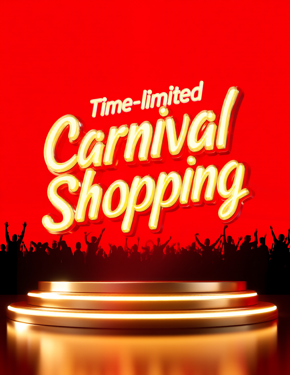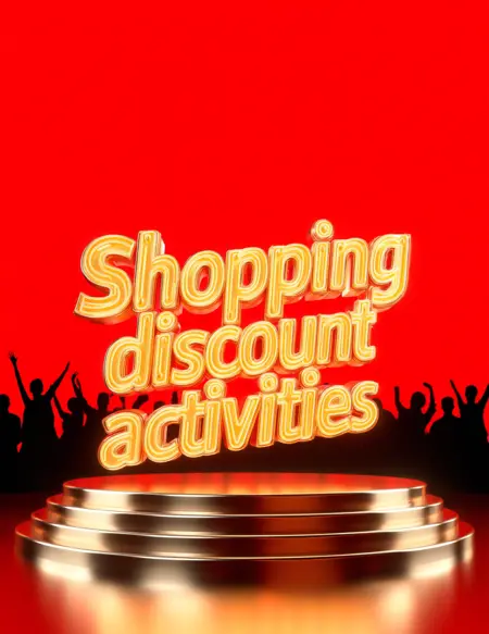 通义千问品牌创意海报,醒目3D字体标语“购物优惠活动”,未来感购物节氛围,发光霓虹灯,C4D金属舞台,耀眼聚光灯,背景人群剪影,鲜艳的红金配色,高对比度,电影级电商海报美学,纯色背景 --ar 1:1 --v 7,