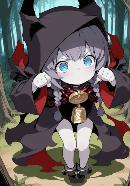 推奨:グレーの髪、パープルの髪、青い目、長い髪、ツインブレード、鈴、束縛、束縛された足首、足首の鎖、鎖、黒いローブ、破れた服、フード付きローブ、手首より長い袖、メダリオン、蒼白い肌、