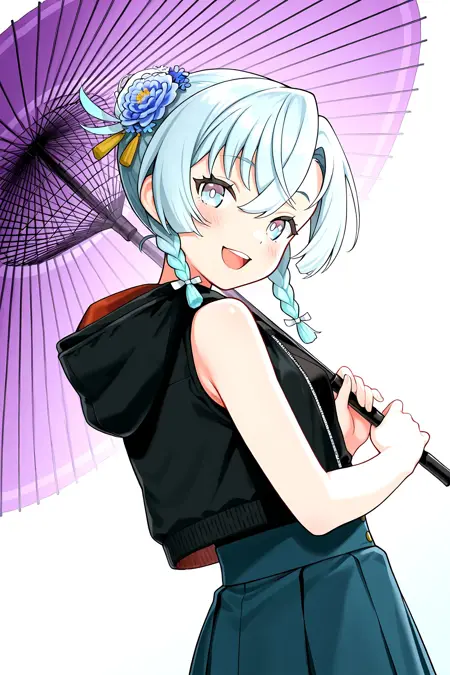 중간 길이 머리, 아쿠아색 머리, 아쿠아색 눈, 옆 땋은 머리, 흰색 머리 리본,