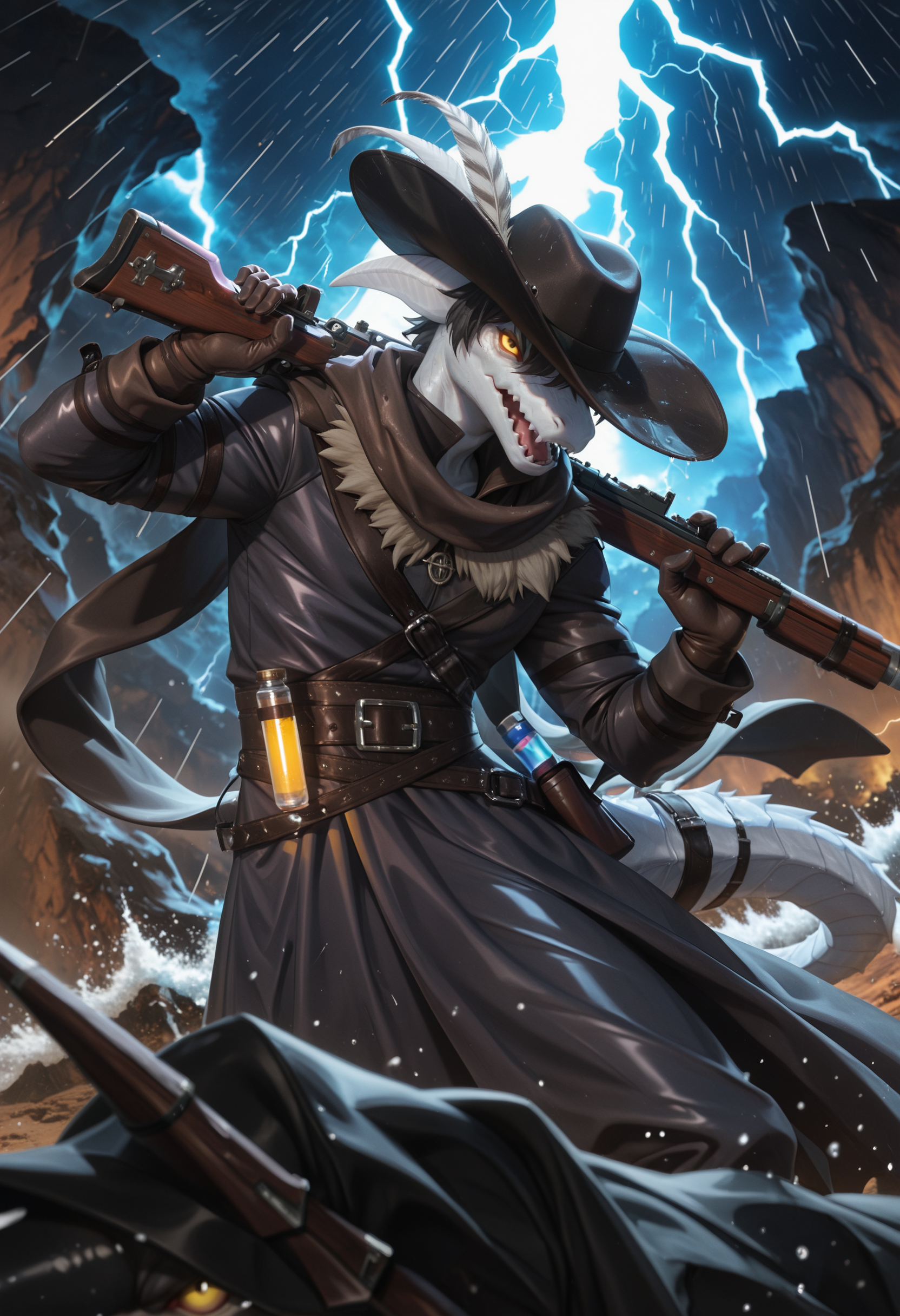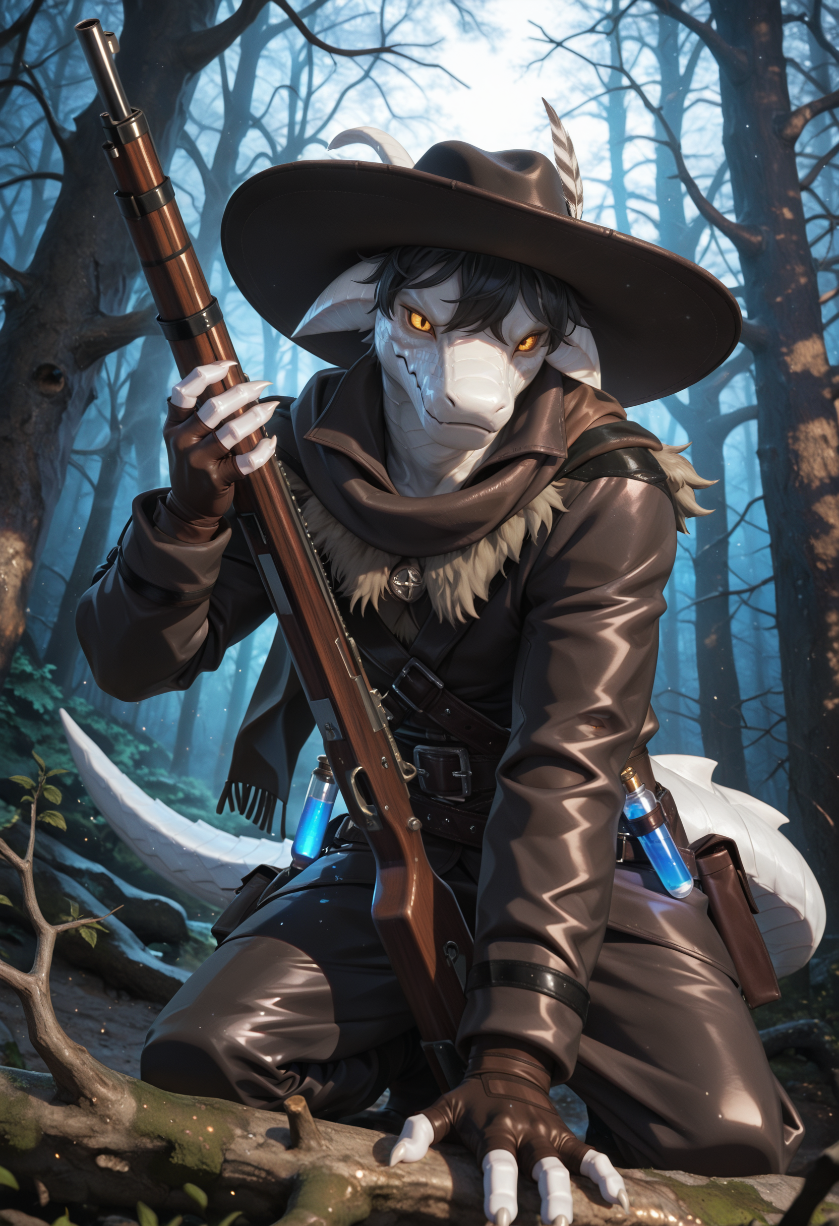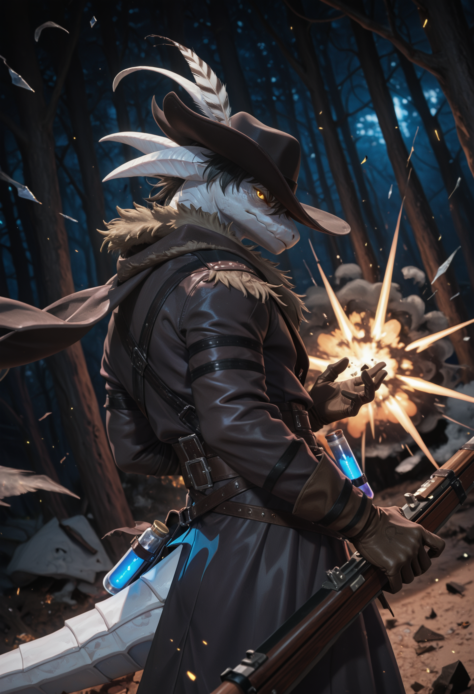 lac3rta_shap3_of_dr3ams, lizard, animal ears, horns, anthro, 1boy, solo, hi res, furry male, black hair, male, furry, yellow eyes, yellow sclera, tail, looking at viewer, scalie, clothing, hat with feather, gloves, belt, coat, scarf, blue glowing vial, looking at viewer, fur trim,