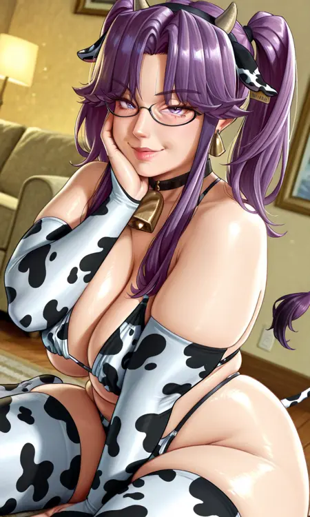眼镜,半框眼镜,下框眼镜,牛仔女孩,牛角,牛耳,仿动物耳朵,耳环,项圈,牛铃,颈铃,铃铛,牛仔服装,牛纹比基尼,高开衩比基尼,露下乳,露肩,新娘手套,肘部手套,过膝袜,印花过膝袜,牛尾,