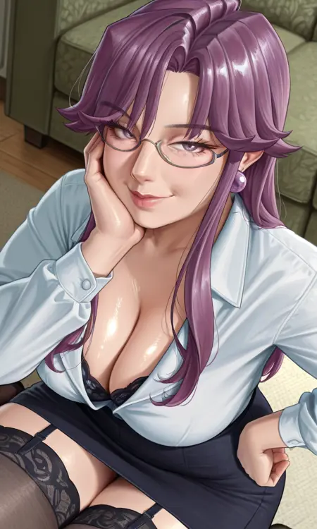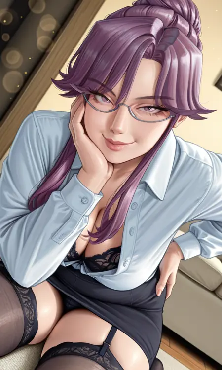 眼镜,半框眼镜,下框眼镜,办公室女士,耳环,珠链,衬衫,白衬衫,白色上衣,长袖,锁骨,胸部显露,铅笔裙,高腰裙,黑裙,棕色丝袜,丝袜,高跟鞋,黑色鞋履,