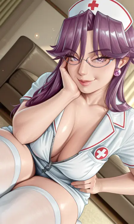 眼镜,半框眼镜,下框眼镜,护士,护士帽,帽子,过膝袜,耳环,长发,白色过膝袜,无内衣,连衣裙,锁骨,部分拉链未拉,拉链全开,深V领,