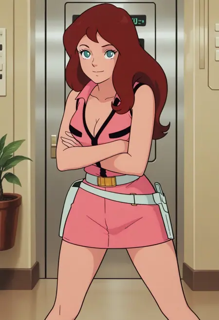 프롬프트 2: FubukiElena, 긴 머리, 청록색 눈, 갈색 머리, 겨드랑이, 빨간 점프수트, 부츠, 어깨 노출, 가슴 사이 틈, 홀스터,