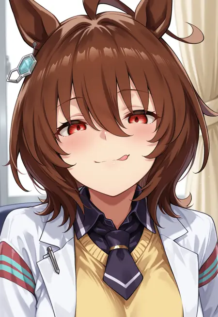 agnesxl1111 illustrious, agnes, brown hair, short hair, ahoge, horse ears, single earring, red eyes,