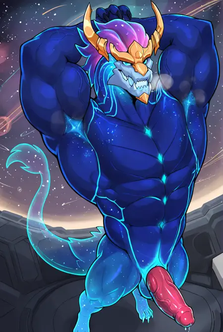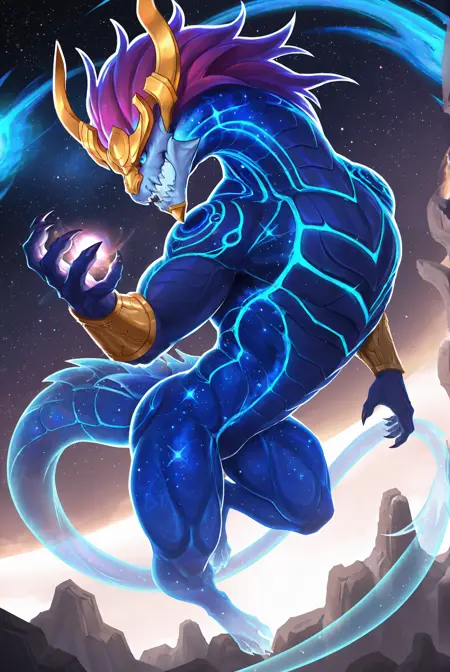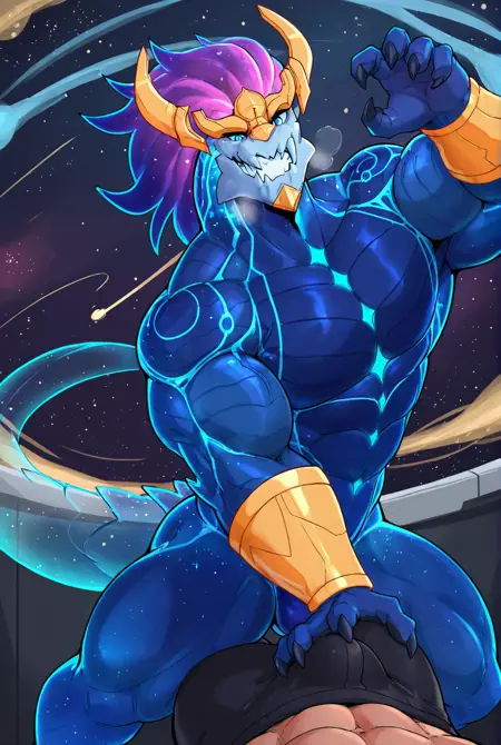 aureli0n s0l, dragon boy, eastern dragon, shiny skin, colored skin, blue skin, blue eyes, transparent tail, tail, horns, teeth, claws, jewelry