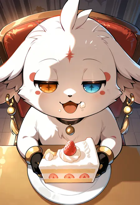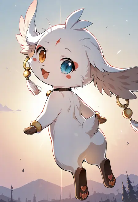 是一个活泼可爱的小个子生物,白色头发带有浅棕色发尖,双眼异色——一只橘色,一只蓝色。