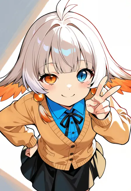 • 添加:"humanized AbbyWW, short girl, white hair with light brown tips, heterochromia eyes (orange and blue), earrings" 以获得一致结果。