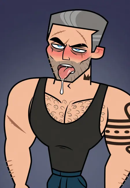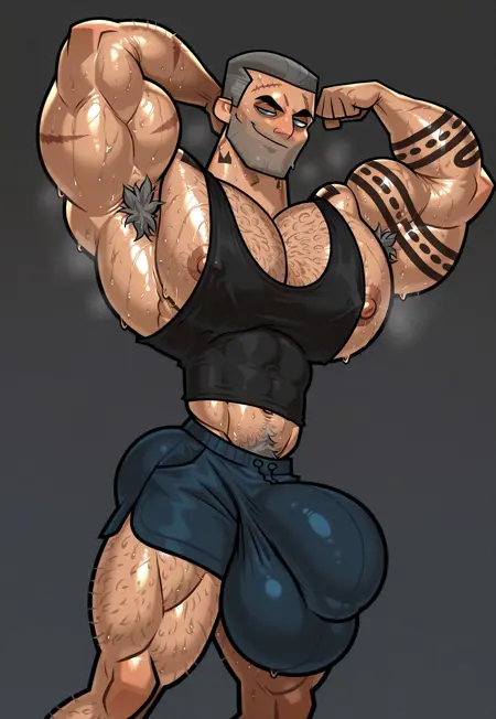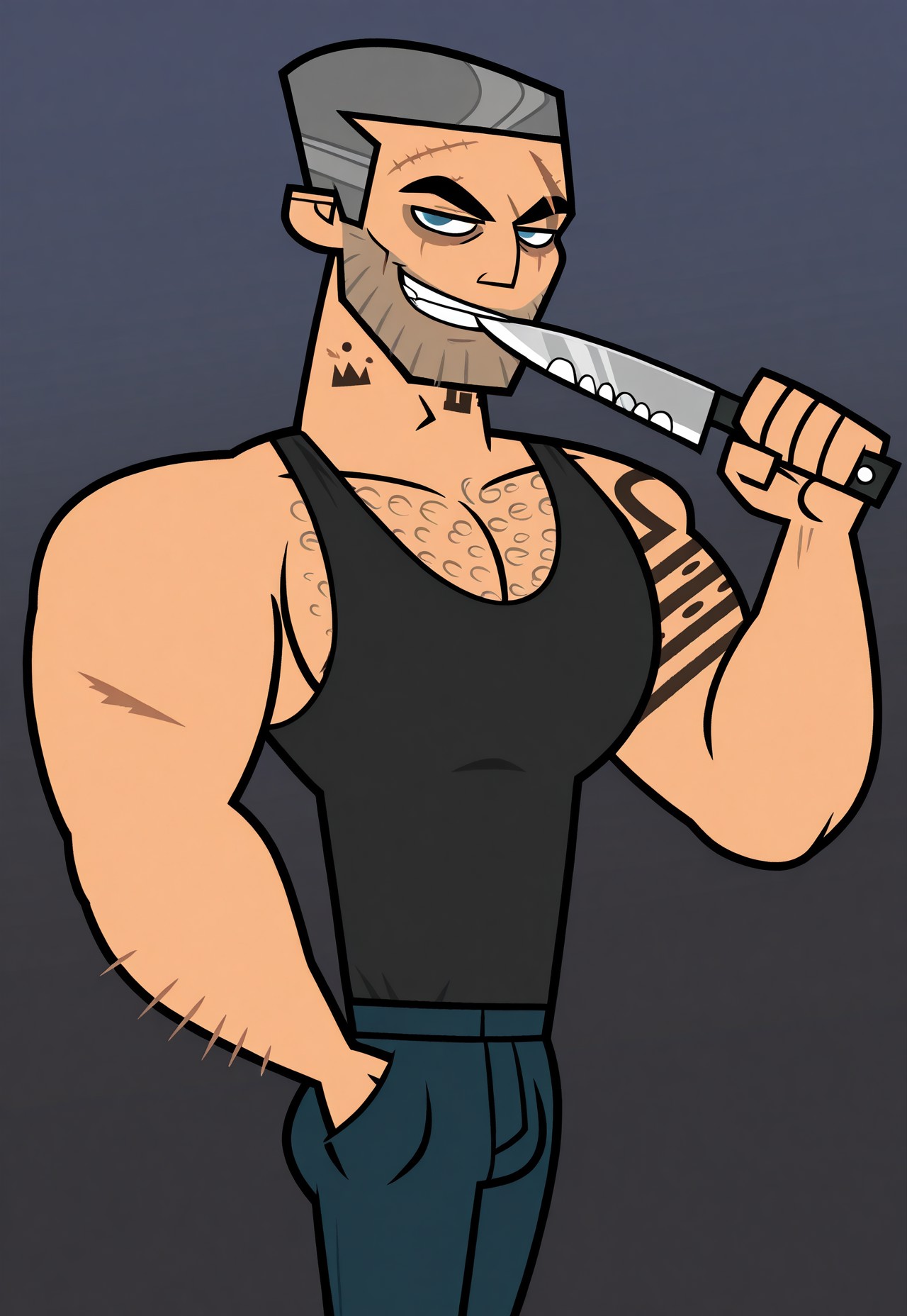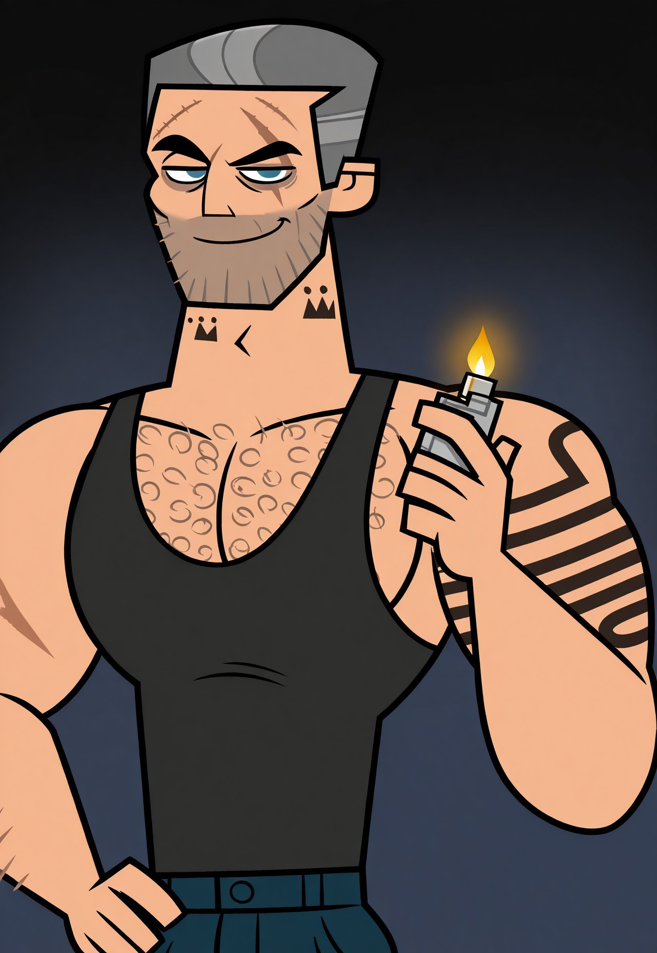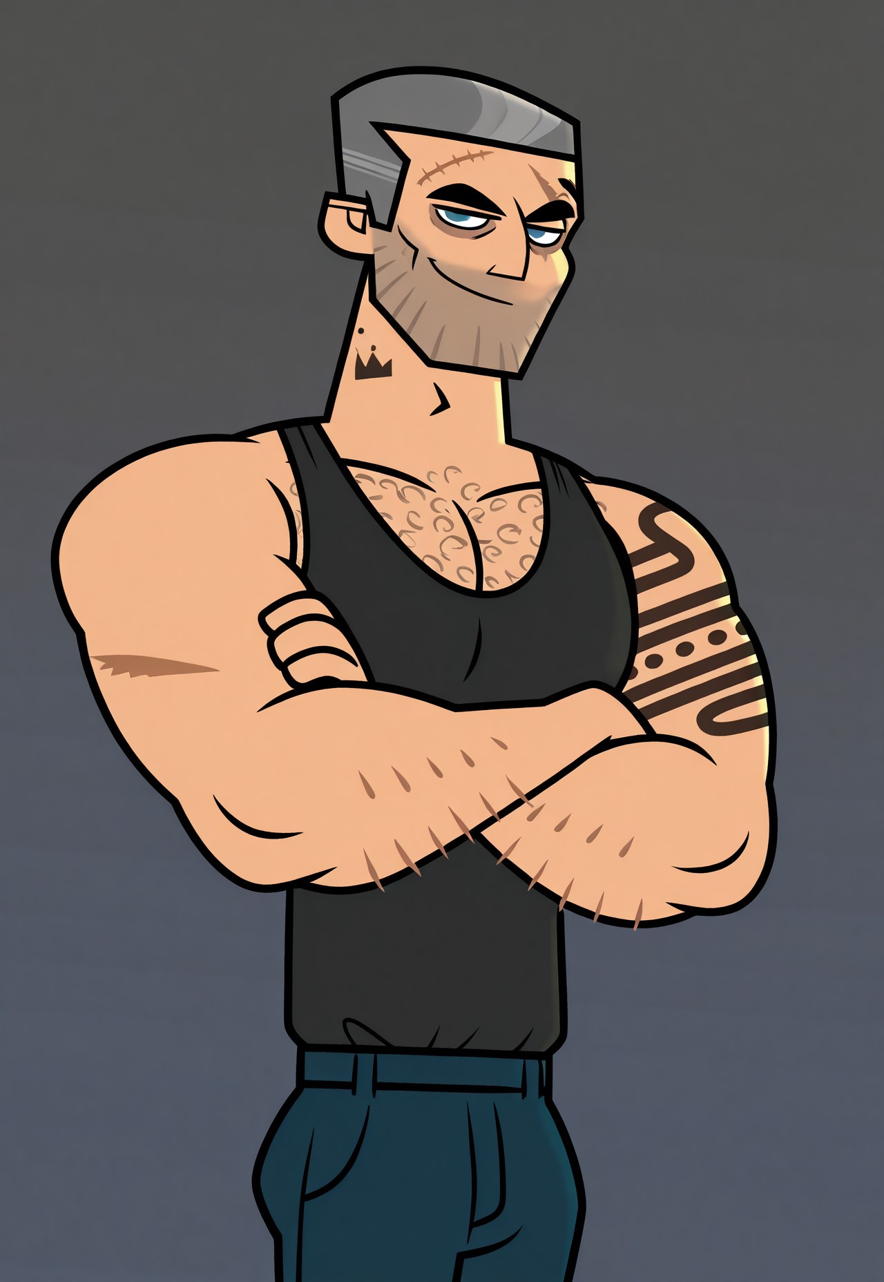 j3ns3n, two-tone grey hair, blue eyes, arm tattoo, neck tattoo, five o’clock shadow, scar on forehead, eye scar, dark circles under eyes, hairy, chest hair