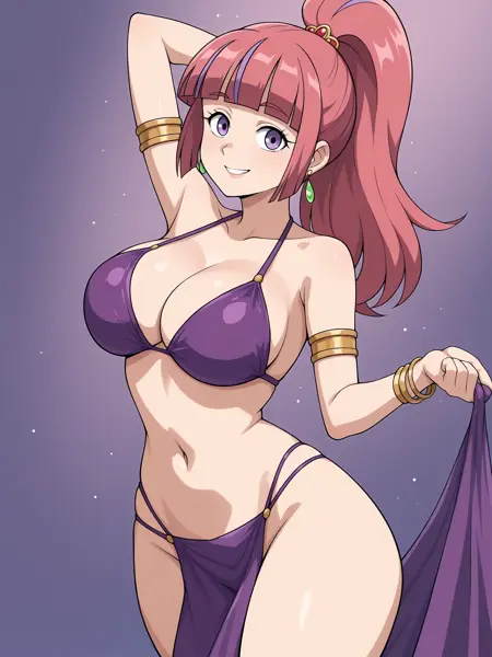 関連する衣装プロンプト:腰布、骨盤カーテン、へそ、腹部、鼠蹊部、太もも、ハレム衣装、ジュエリー、胸元、裸の肩、透け感