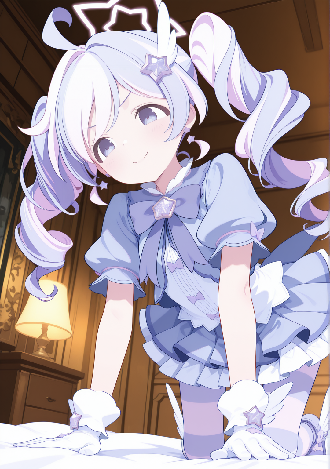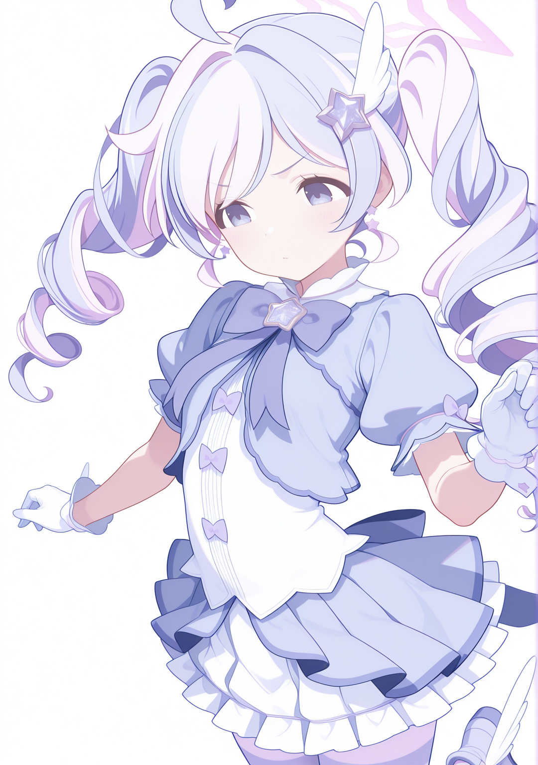 recommend:purple hair,pink hair,purple eyes,twin drills,drill hair,long hair,multicolored hair,two-tone hair,ahoge,star earrings,frilled skirt,gloves,pink halo,pleated skirt,layered skirt,puffy short sleeves,purple bow,purple bowtie,frilled dress,ringlets,striped pantyhose,purple footwear,winged footwear,white gloves,white hair,white shirt,wing hair ornament,star hair ornament,