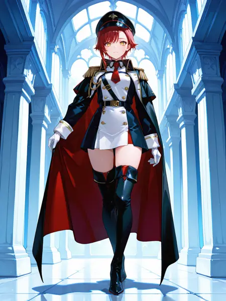 black headwear, peaked cap, epaulettes, aiguillette, red necktie, long sleeves, white gloves, black shawl, two-tone dress, military uniform, military, black cape, black footwear, thigh boots, high heels,