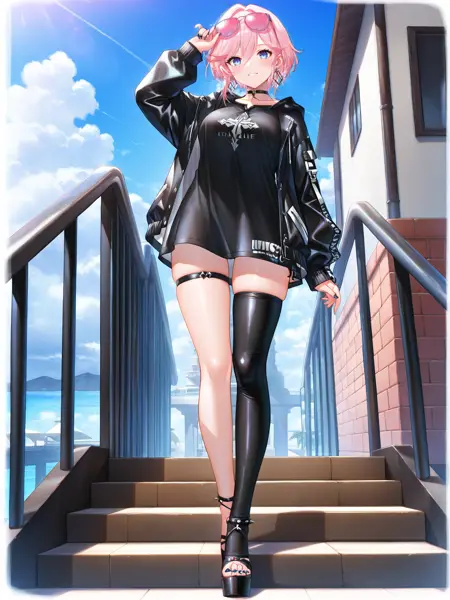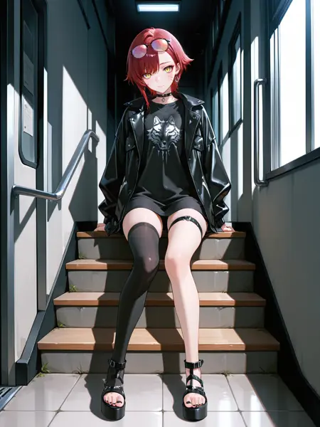 보석, 귀걸이, 초커, 틴트된 선글라스, 머리 위의 안경, 긴 소매, 손톱 매니큐어, 검은 셔츠, 긴 셔츠, 벌어진 재킷, 검은 재킷, 허벅지 스트랩, 한쪽 허벅지 부츠, 검은 허벅지 부츠, 플랫폼 샌들, 발가락, 발톱 매니큐어,