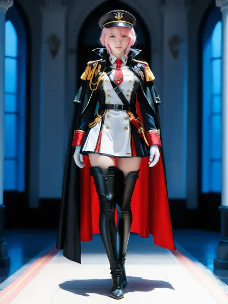 검정색 머리장식, 뾰족한 모자, 어깨장식, 에피레트, 빨간 넥타이, 긴 소매, 흰 장갑, 검정 스카프, 이색 드레스, 군복, 군사, 검정 망토, 검정 신발, 허벅지 부츠, 하이힐,