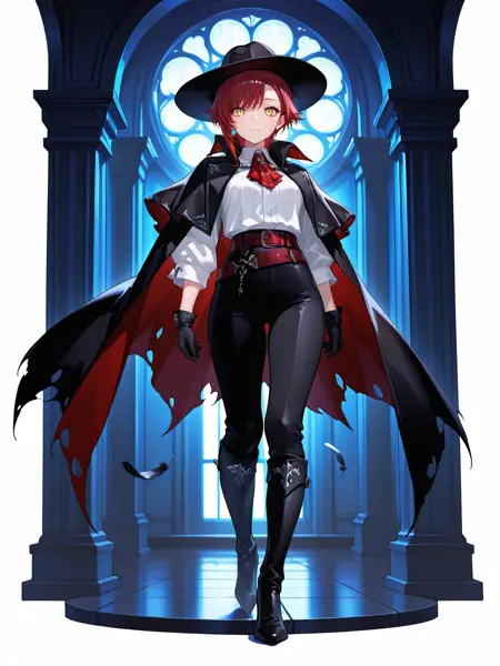 black hat, black cape, torn cape, ascot, shirt, black gloves, feathers, belt, black pants,black footwear, knee boots, high heel boots,