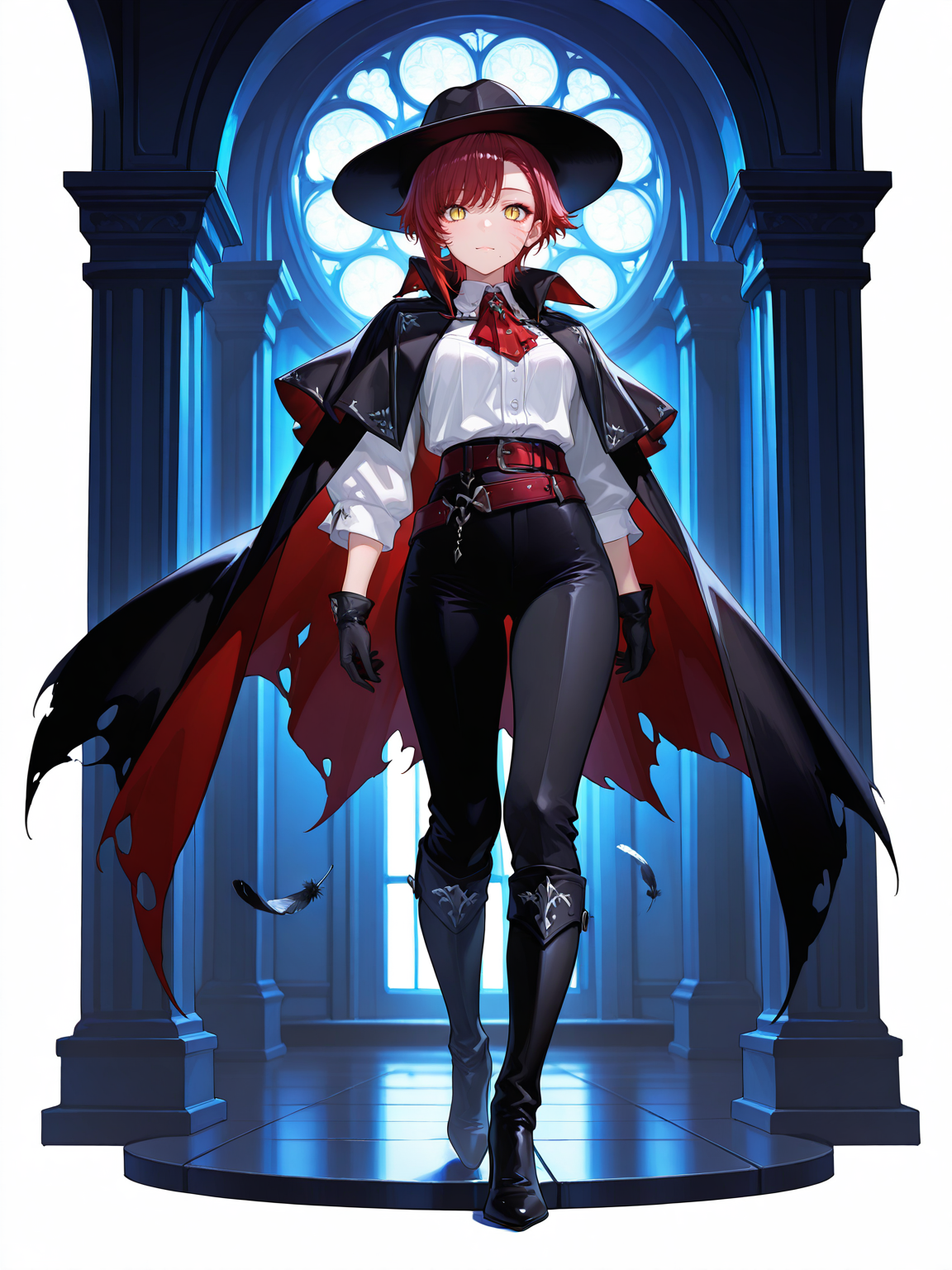 검은 모자, 검은 망토, 찢어진 망토, 애스콧, 셔츠, 검은 장갑, 깃털, 벨트, 검은 바지, 검은 신발, 무릎 부츠, 하이힐 부츠,