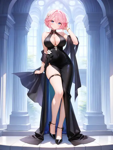 머리 장식, 보석, 검은 드레스, 가슴 노출, 헬터넥, 숄, 소매 없음, 손톱 매니큐어, 허벅지 스트랩, 검은 하이힐,