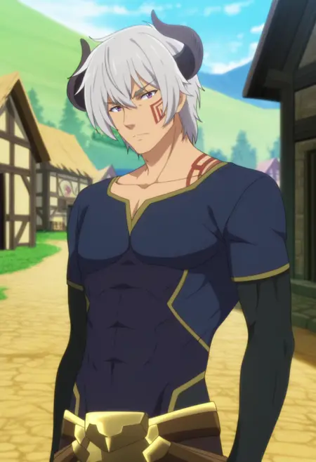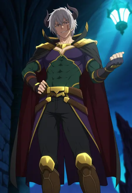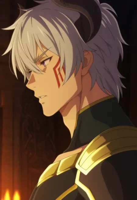 diablo, grey hair, purple eyes, short hair, horn