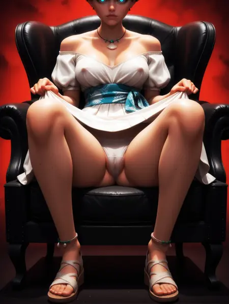 복장 프롬프트: dress, white dress, necklace, bare shoulders, off shoulders, sash, short sleeves, puffy sleeves, shell, anklet, sandals
