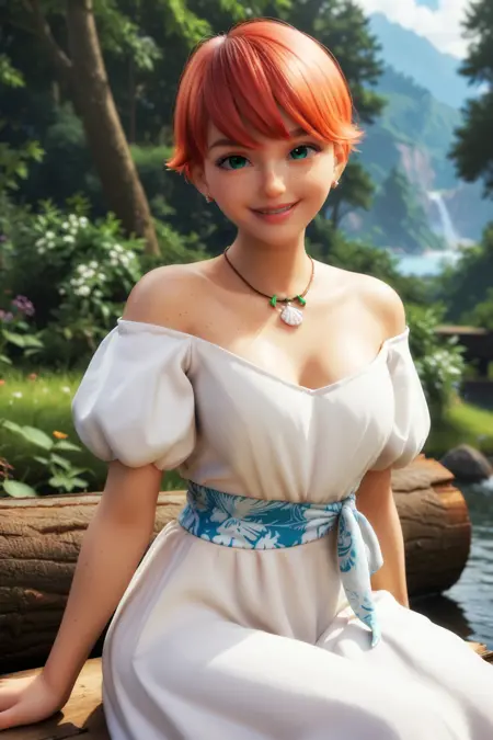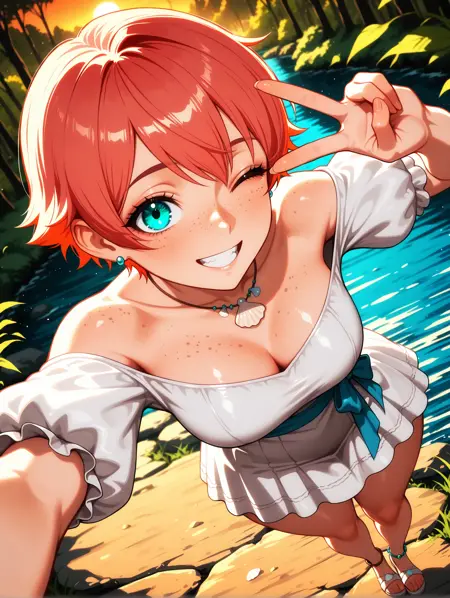 온딘 프롬프트: 1girl, freckles, short hair, very short hair, pink hair, red hair, turquoise eyes, orange hair, bangs