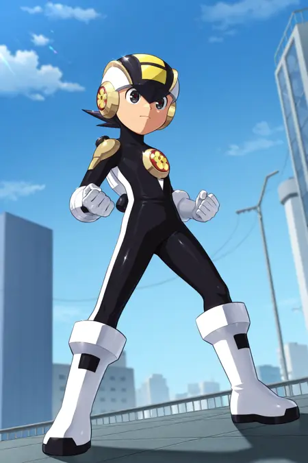 mega_hana, black hair, black eyes, black bodysuit, white helmet, white glove, white boots