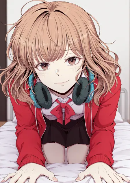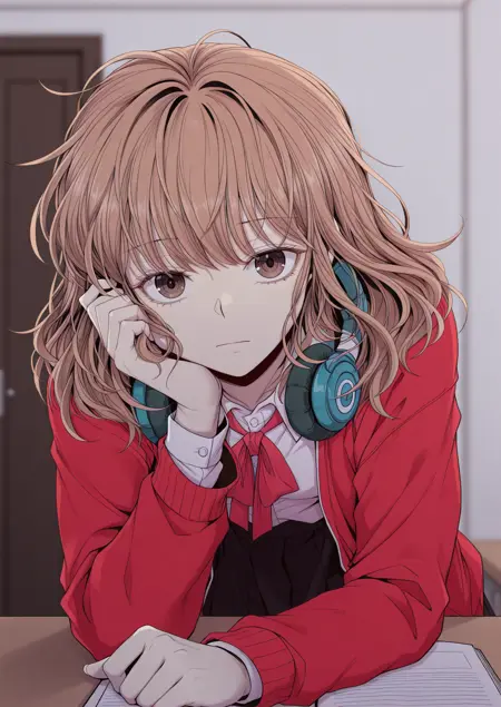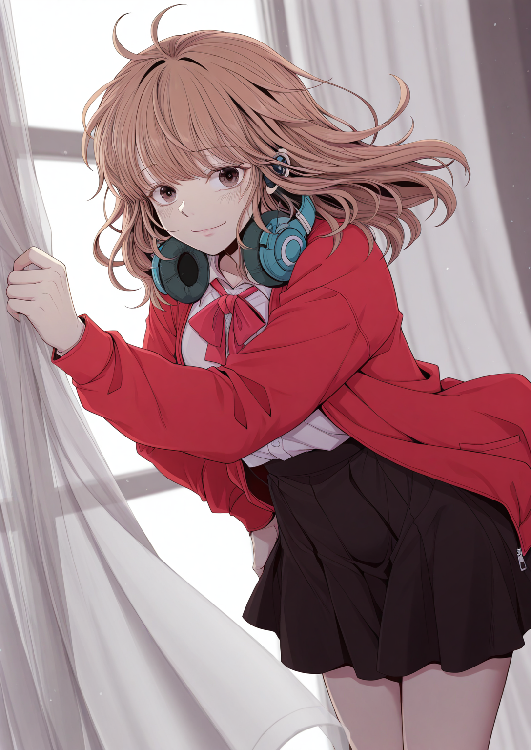 light brown hair, medium hair, brown eyes, red jacket, white shirt, red ribbon, black skirt, headphones around neck