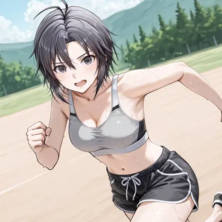 トリガー: Makoto, 1girl, kikuchi makoto, 黒いショートパンツ, 黒髪, 短髪, へそ, スポーツブラ, アンテナ髪, 腹部, ダルフィンショートパンツ, 黒目, 鎖骨, 短いショートパンツ, 目の間の髪, スポーツウェア
