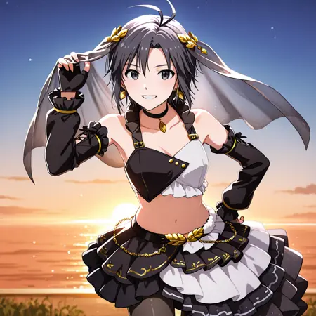 コンサート衣装付きトリガー: MakotoConcert, 1girl, kikuchi makoto, 黒髪, 短髪, フィンガーレスグローブ, ジュエリー, ピアス, ヴェール, 腹部, 黒目, へそ, アンテナ髪, パンティストッキング, デタッチドスリーブ, チョーカー, スカート, ベルト, 黒手袋, クロップトップ