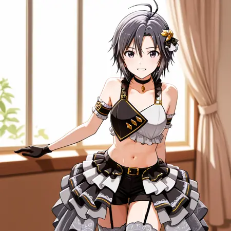 替代演唱会服装触发词:MakotoConcert2, 1girl, kikuchi makoto, 灰色过膝袜, 黑色手套, 短发, 黑色头发, 露脐, 脐部, 腹部, 手臂绑带, 层叠裙, 发饰, 天线发, 项圈, 超短裙, 锁骨, 黑色裙子, 黑色短裤, 紫色眼睛, 闪亮头发, 高跟鞋, 绝对领域, 腰带扣, 胳膊带, 荷叶边, 短上衣, 吊袜带, 发丝遮眼, 牛仔构图