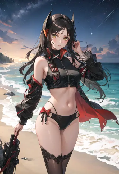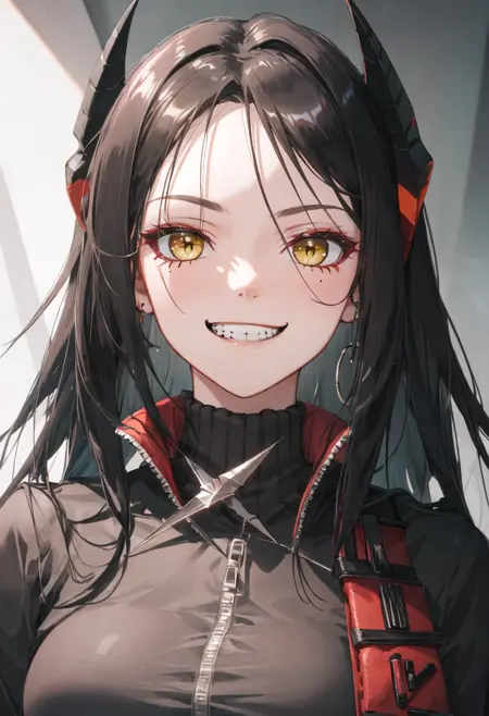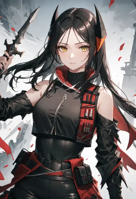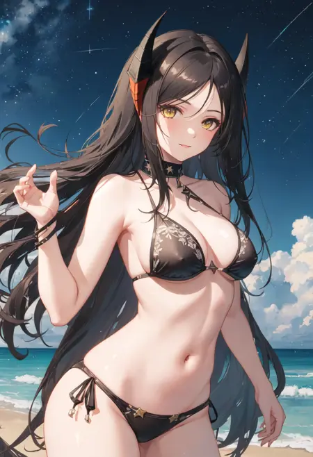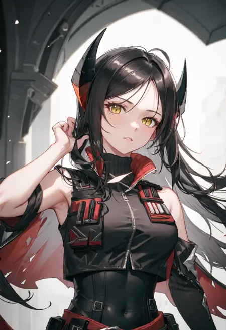 - 已精简的角色标签为:black_hair、long_hair、horns、yellow_eyes、breasts、bangs、large_breasts、very_long_hair。当角色的核心特征(如发色)不够稳定时,您可以在提示词中添加这些标签。