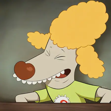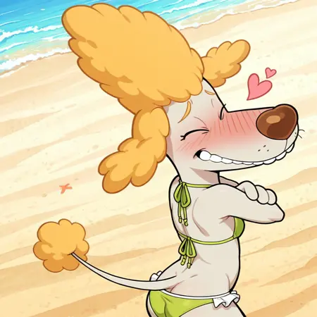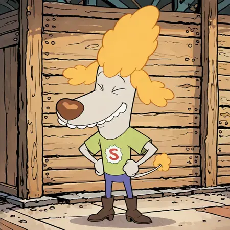 | 训练词汇 | white boots with skates, green single strap leotard with skirt,已复制! black leather jacket,已复制! poodle girl, solo, yellow bouffant hair, yellow fluffy ears, squinting closed eyes, large brown nose, showing rounded teeth, long snout, long thin tail, green "S" shirt, blue jeans, brown boots with heels,已复制! |