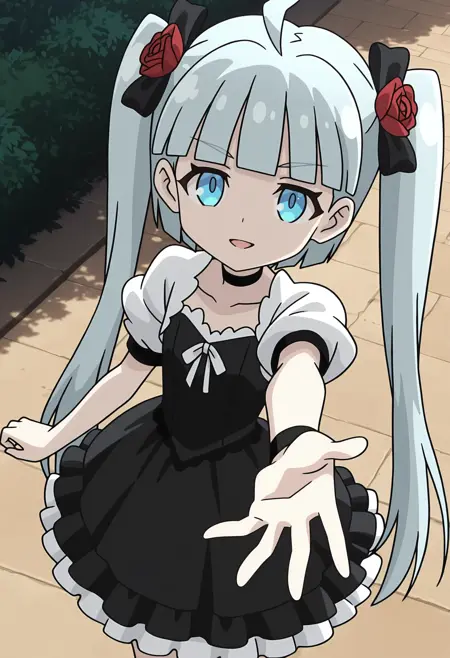 - gntycrty,齐刘海,长发,双马尾,发带,黑色发带,发饰,玫瑰,黑色项圈,黑色连衣裙,白色袖子,蓬松短袖,白色丝带,荷叶边连衣裙,