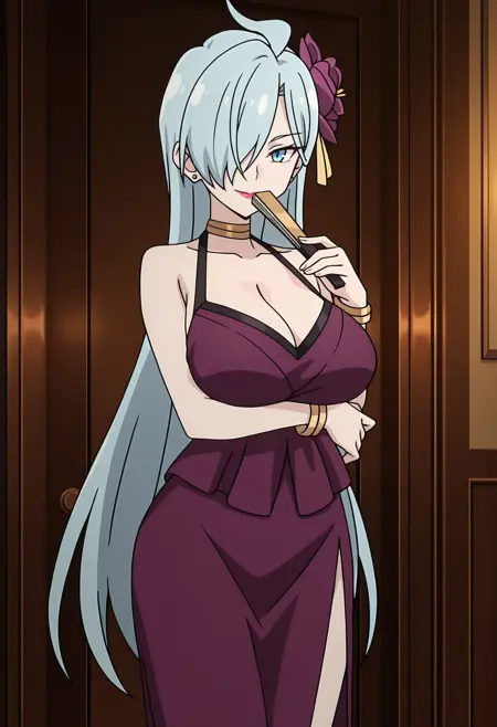 - gntycrol,成熟女性,口红,长发,头发遮住一只眼睛,吊眼,发饰,耳钉,露肩装,黑色肩带,金色项圈,无袖连衣裙,胸部显露,紫色连衣裙,黄色丝带,长裙,深紫色长裙,侧开叉,手镯,