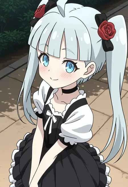 - gntycrty, 둔한 앞머리, 긴 머리, 쌍꼬리, 머리 리본, 검은 리본, 머리에 꽃, 장미, 검은 목걸이, 검은 드레스, 흰색 소매, 볼륨 있는 짧은 소매, 흰색 리본, 프릴 드레스,