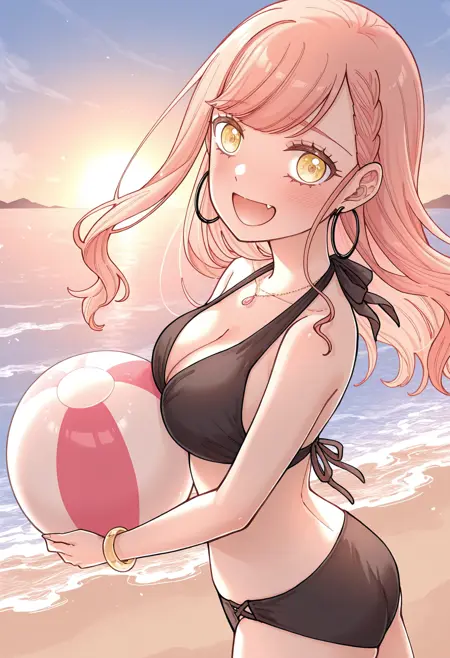 black bikini, halterneck, cleavage, necklace, bracelet,