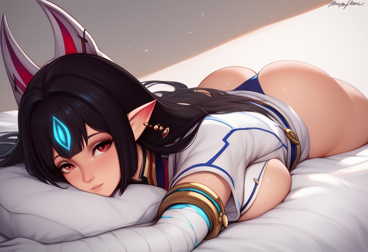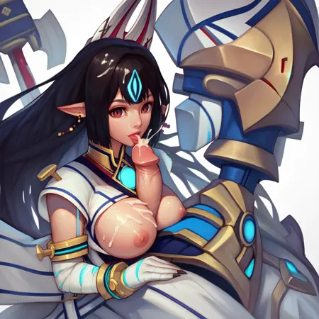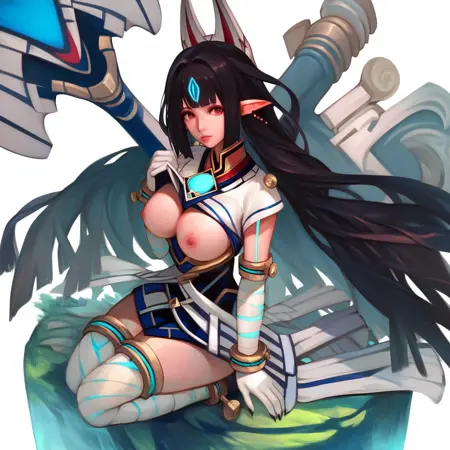 (Xenoblade_Kasandra, 長い髪, 黒髪, 動物の耳, 赤い目, 尖った耳, ジュエリー, ピアス, 狐のマスク, 頭にマスク, 日本衣装, 手袋, ハンマー),