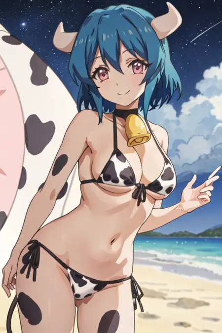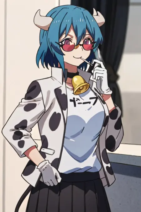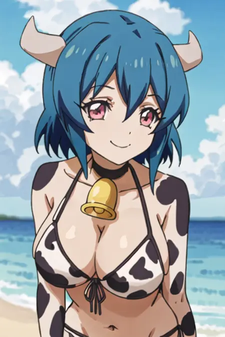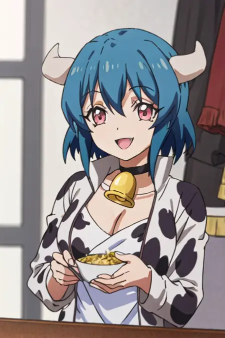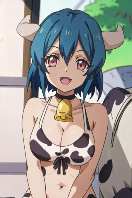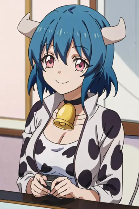 トリガー語はminosu_jashinchandropkick、推奨タグはbest quality, masterpiece, highres, solo, {minosu_jashinchandropkick:1.15}, blue_hair, horns, short_hair, bell, cow_horns, neck_bell, cowbell, cow_print, animal_print, cow_girl, red_eyes, hair_between_eyes, smile, closed_mouth, pink_eyesです。